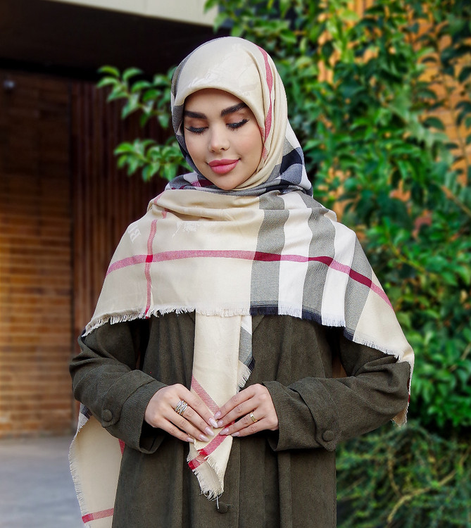 روسری کشمیر طرح باربری رنگ کرم