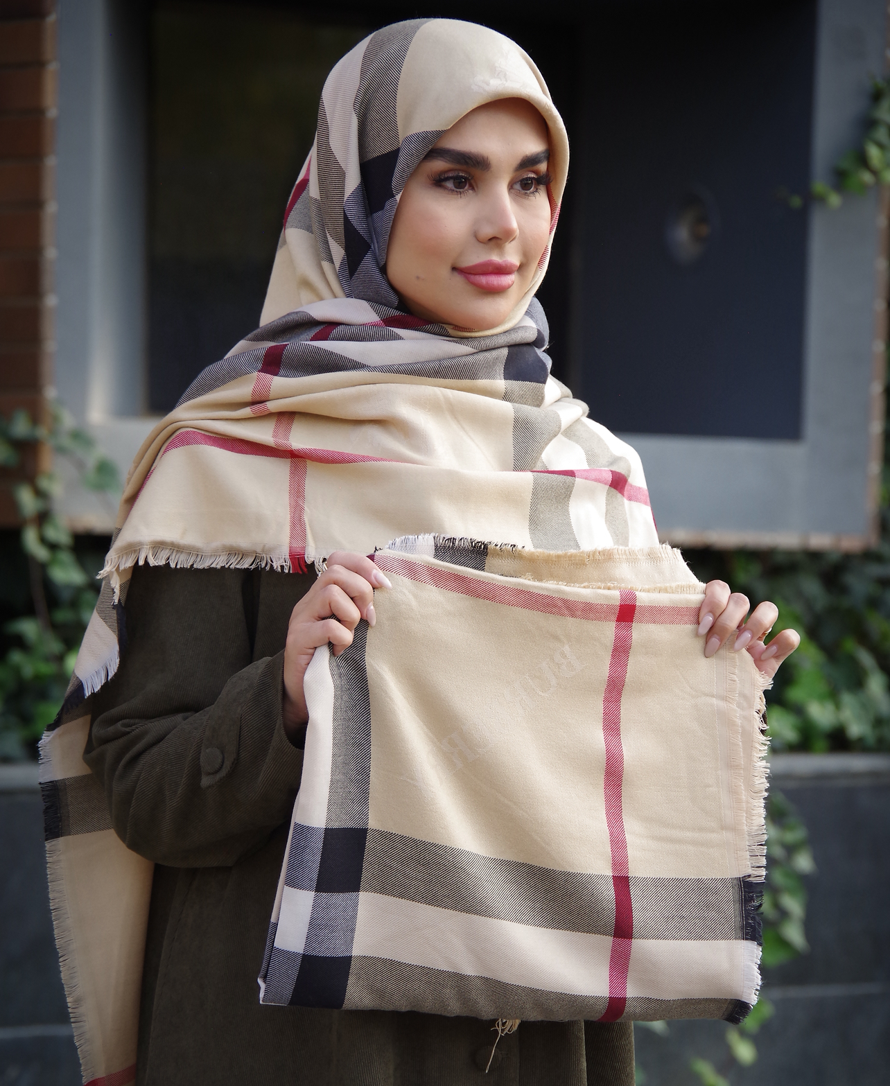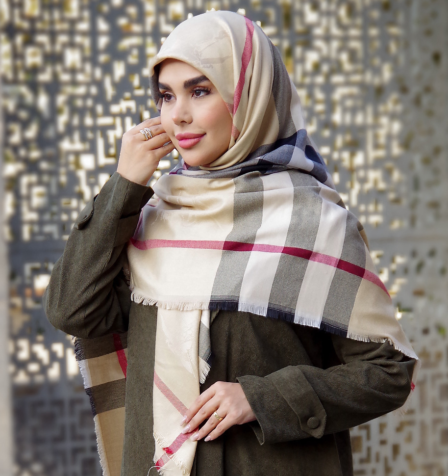روسری کشمیر طرح باربری رنگ کرم